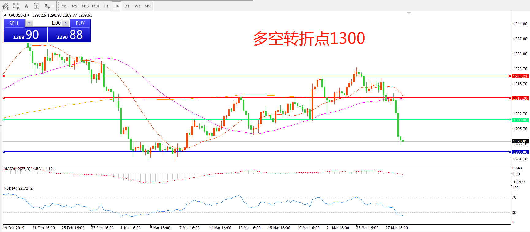 现货黄金周四(3月28日)跌近20美元,连破1310  1300  两道关口,1285支撑岌岌可危。