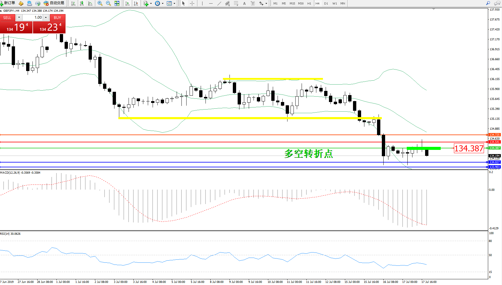 交易策略:134.387下方看跌,目标134.027、133.903