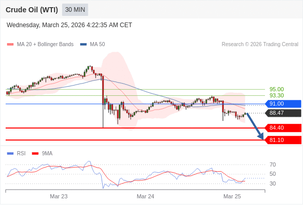 交易策略: 在 91.00 之下,看跌,目标价位为 84.40 ,然后为 81.10 。