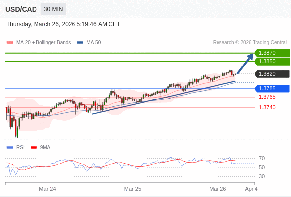 在 1.3785 之上,看涨,目标价位为 1.3850 ,然后为 1.3870 。