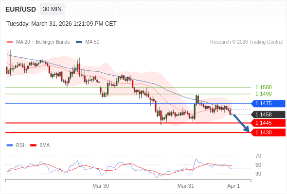 在 1.1475 之下,看跌,目标价位为 1.1445 ,然后为 1.1430 。