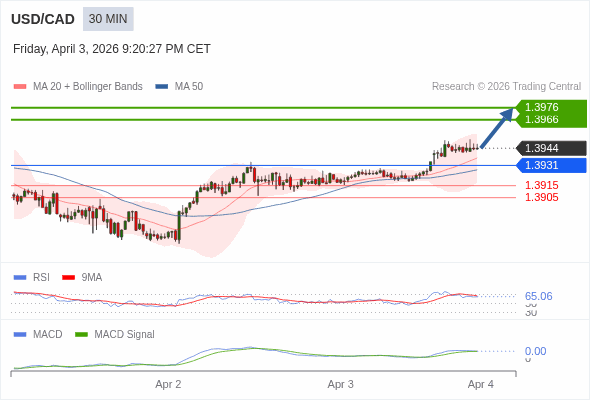美元/加元 当日内 : 看涨,当 1.3931 为支撑位。