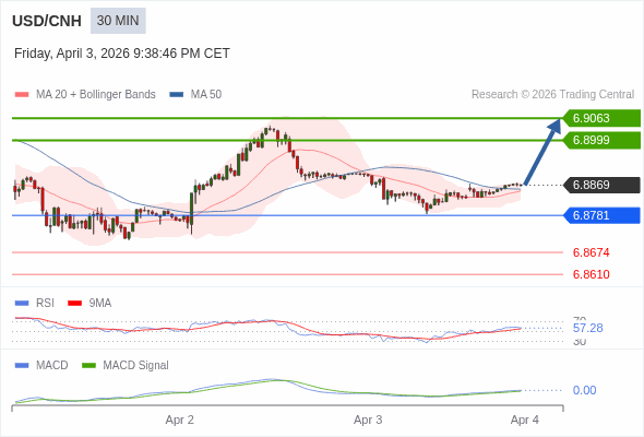 美元/人民币 当日内 : 看涨,当 6.8781 为支撑位。