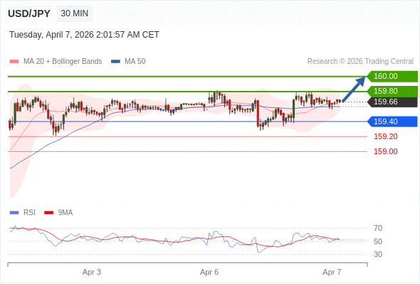 在 159.40 之上,看涨,目标价位为 159.80 ,然后为 160.00 。