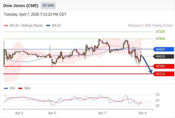 在 46800 之下,看跌,目标价位为 46390 ,然后为 46210 。