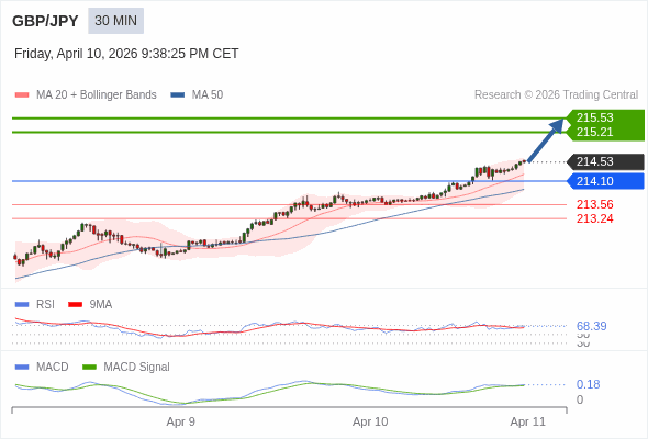英镑/日元 当日内 : 看涨,当 214.10 为支撑位。