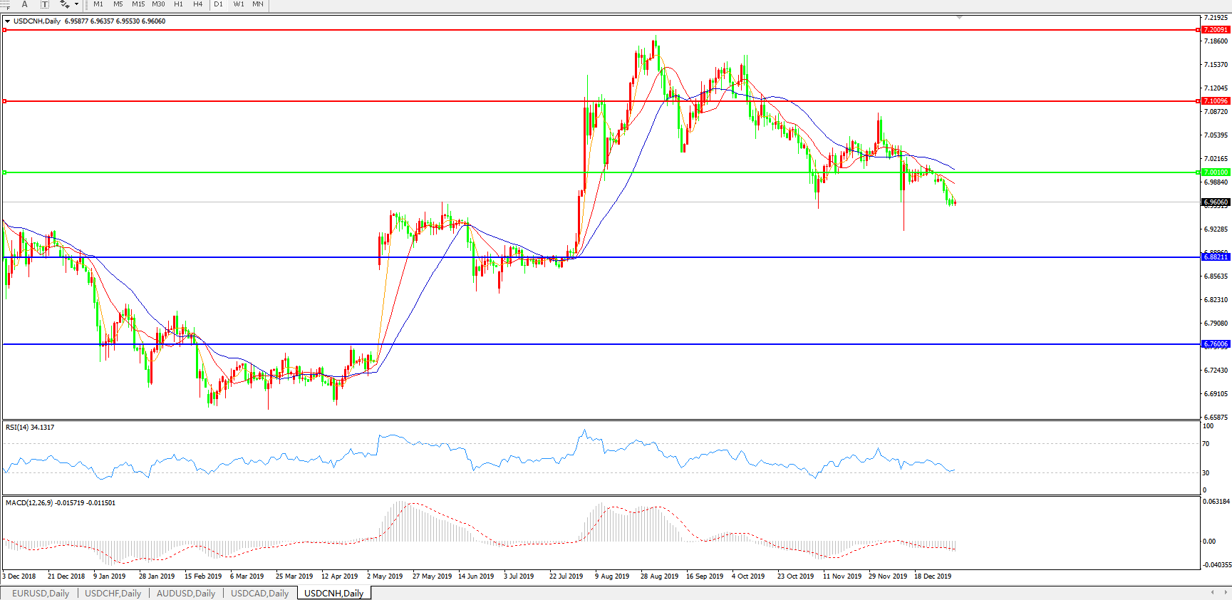 交易策略: 在7.0000之下,看跌,目标价位为6.8820,然后为6.7600。