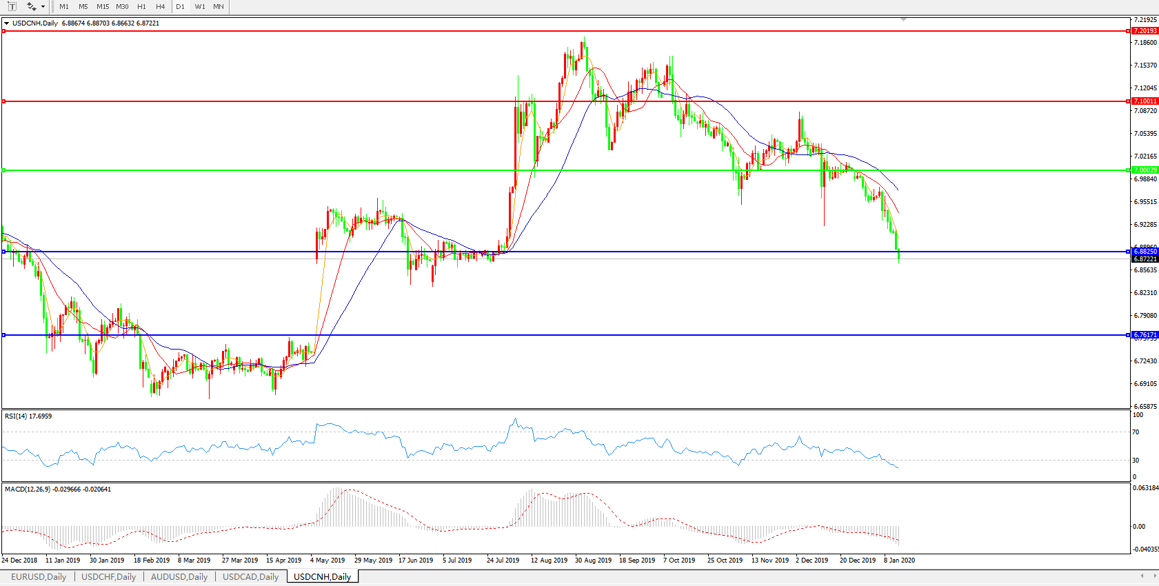 交易策略: 在7.0000之下,看跌,目标价位为6.8820,然后为6.7600。