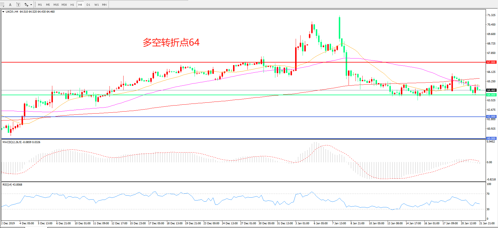 4小时图看,油价延续低位震荡走势, 64美元仍是短期多空分水岭,如能顺利突破站稳,行情有望迎来反弹,均线系统走平,MACD绿柱减少,RSI指标向上,日内震荡上行概率较大。