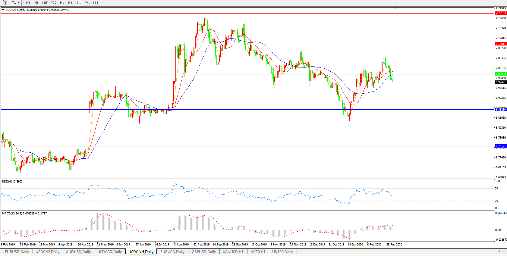 交易策略: 在7.0000之下,看跌,目标价位为6.8820,然后为6.7600。