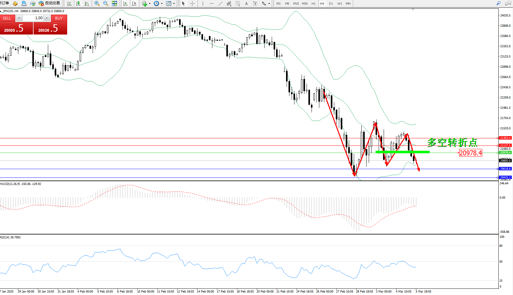 日经指数JPN225——4小时K线图显示: