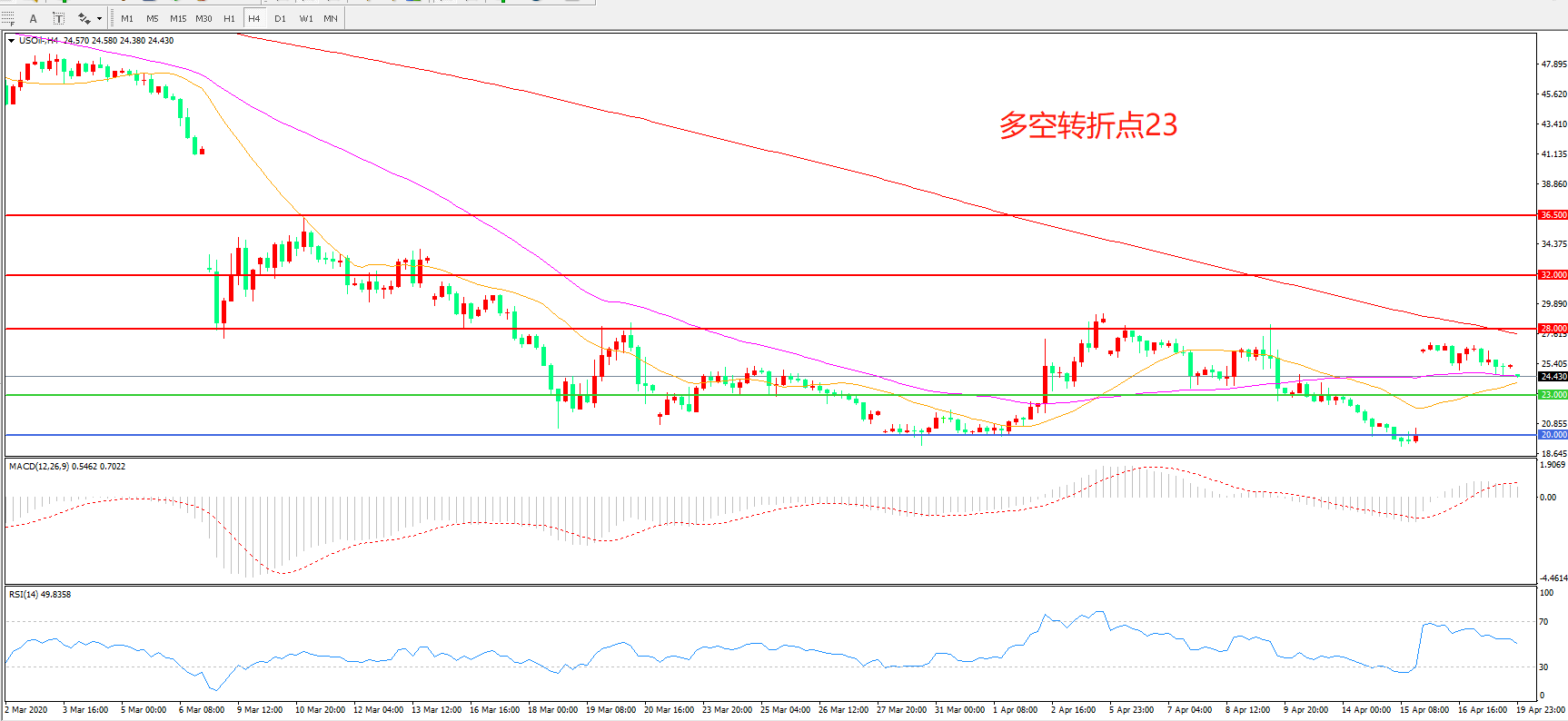 交易策略:在23.00之下看跌,目标20.00         18.00