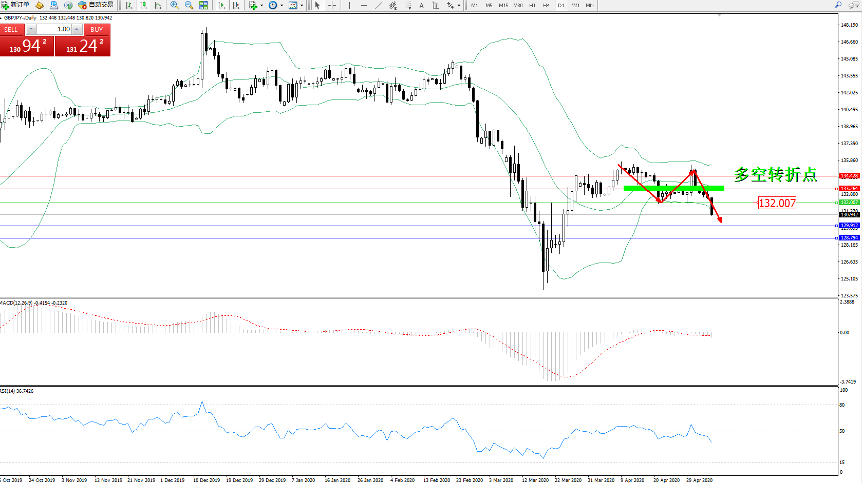 交易策略:132.007下方看跌,目标129.912128.794