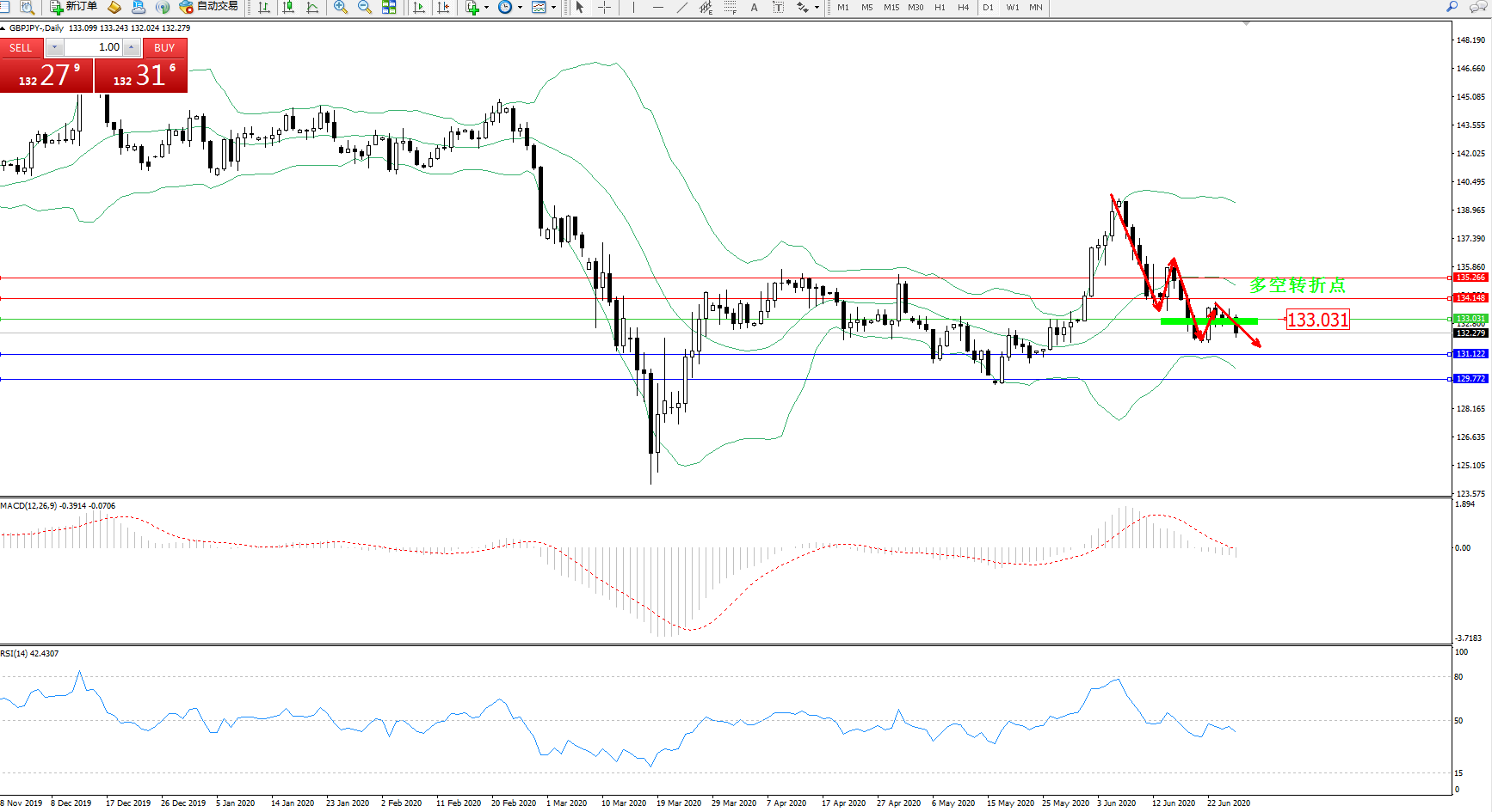 交易策略:133.031下方看跌,目标131.122129.772