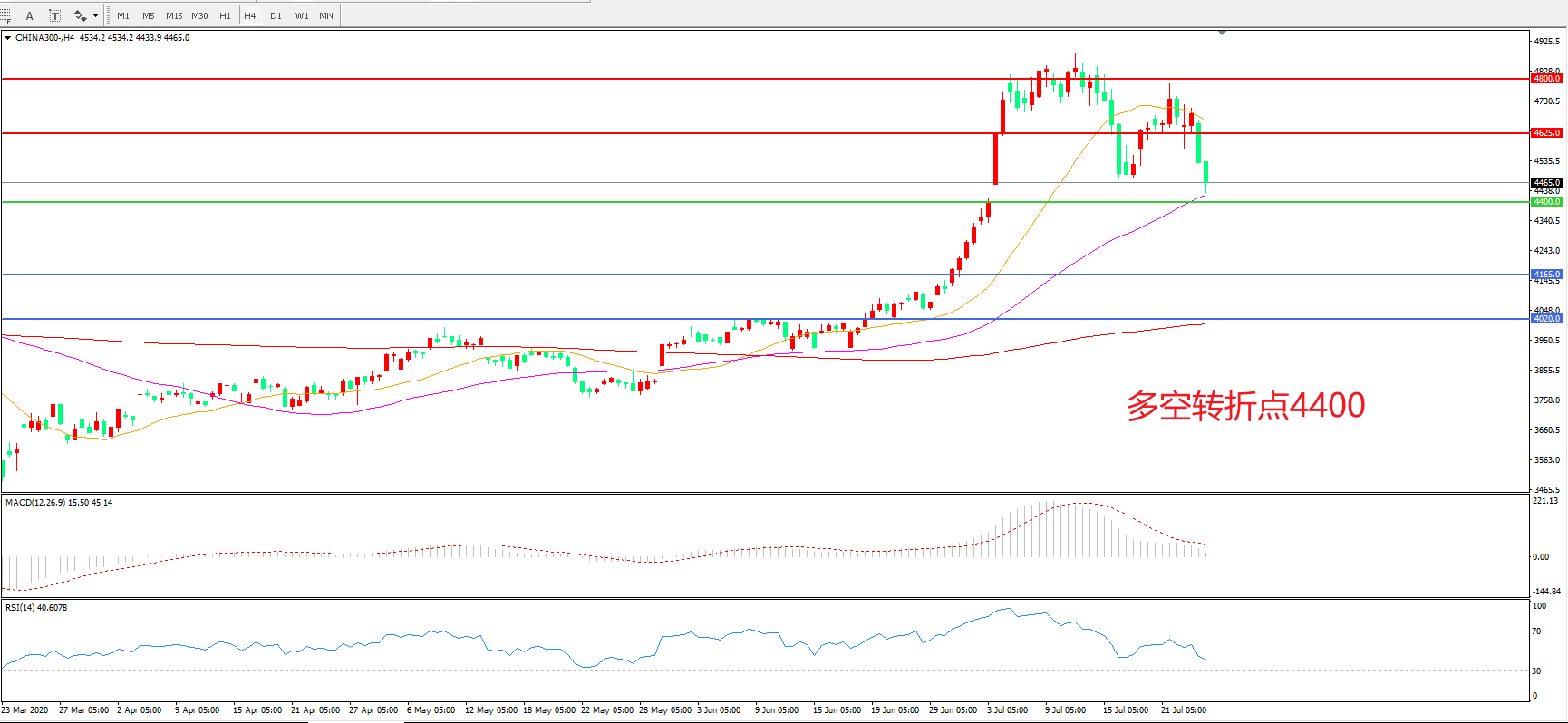 4小时图看,沪深300长阴下破,短期走势偏弱,4400是前期涨势起点,也是55周期均线支撑,如能在此企稳,有望出现进一步上行。