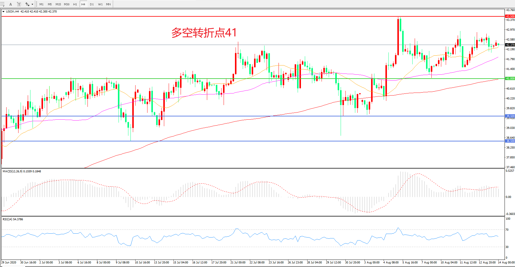 周四(8月13日),基本面市场和宏观市场依然没有发生较大的变量,国际油市风平浪静,美国WTI原油延续高位震荡,收报42.39美元/桶。随着近期原油需求温和复苏,美油始终维持在40美元上方,显示出明显的抗跌性,一旦近期在这个长周期均线确立支撑,或上探50美元关口。