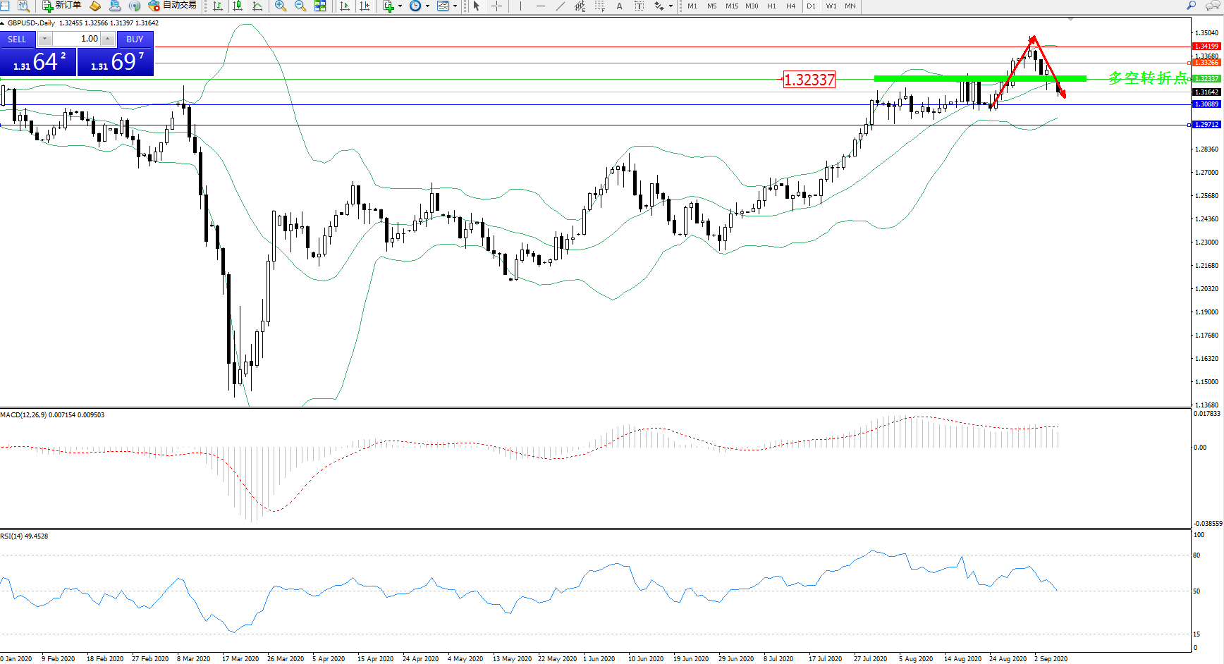 交易策略:1.32337下方看跌,目标1.30889、1.29712