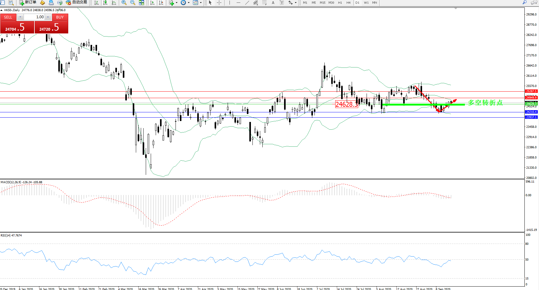 香港恒生指数9月16日(周三)收盘下跌7.13点,跌幅0.03%,报24725.63点;港股主要指数呈震荡行情,恒指全日振幅不超0.8%,恒生科技指数涨1.11%。中芯国际升3.6%;水务股跌幅靠前,恒生科技股涨跌各半,头部科技股强势,阿里升2%,小米、美团涨1.8%,腾讯涨1%,京东跌超1%。今日南下资金净流入28.11亿港元,大市成交额为1029亿港元。,当前港股呈现震荡走势,中期重要支撑在23000点。中期展望的观点:“螺旋式轮动配置”理念,遵循“成长-周期-消费”的板块轮动。配置方向上,短期市场关注点在盈利确定性较强的必需消费、物业管理、黄金股。中期重点关注消费股和周期股。