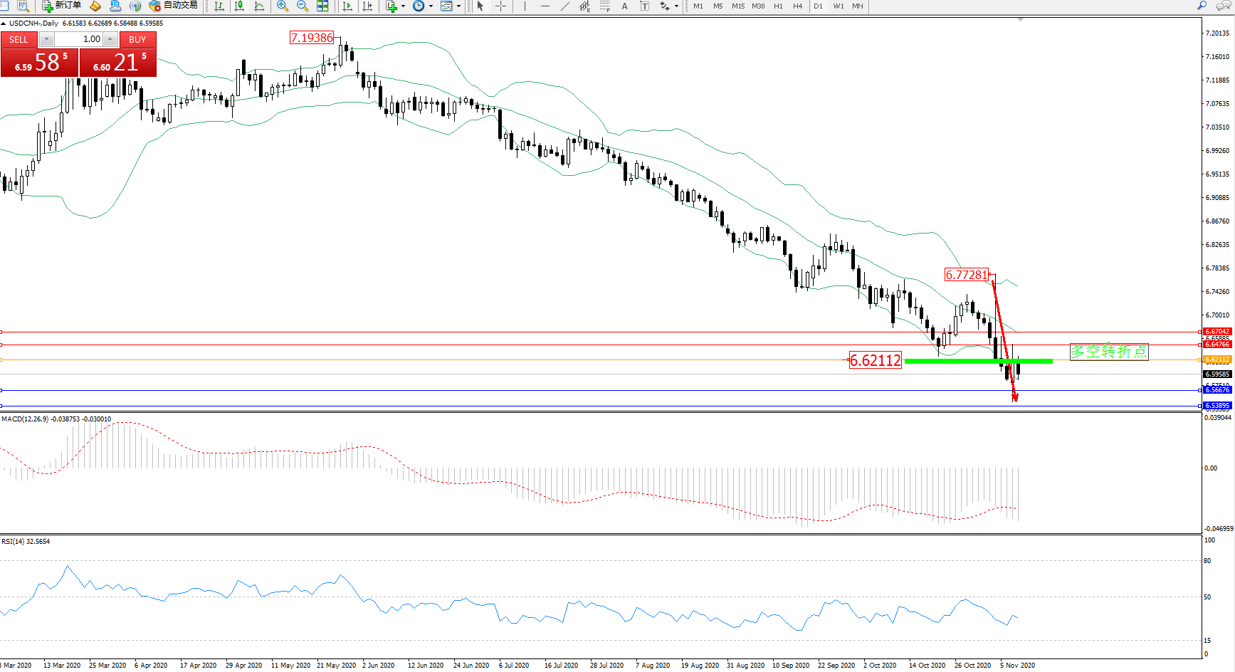 美元人民币USDCNH——日K线图显示: