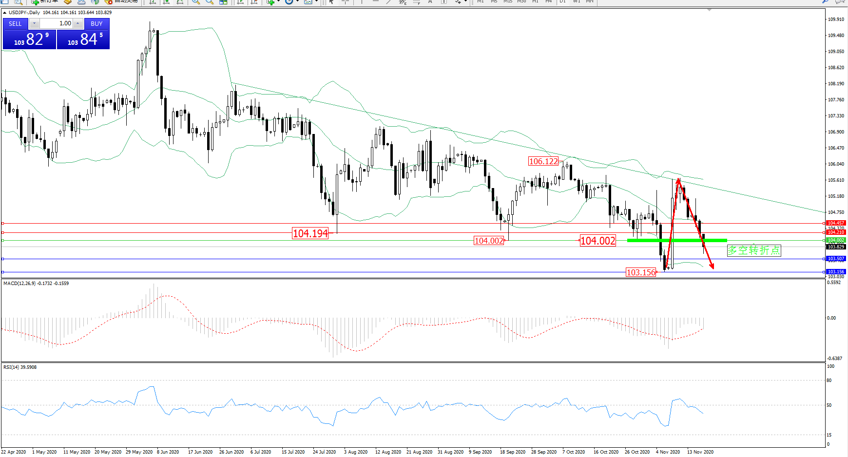 技术点评:低位多头动力趋势拉升上扬后,高位即将触及布林带指标上轨附近出现反转震荡下行走势,跌势未有止步迹象,空头动力强劲,布林带指标呈收口平移走势持续中,且有继续向下移动态势,前期低位103.156位置近在咫尺,MACD指标处于空头区域低位震荡回升后开始反转下行中,RSI指标处于50均衡线下方弱势整理后开始下行中;