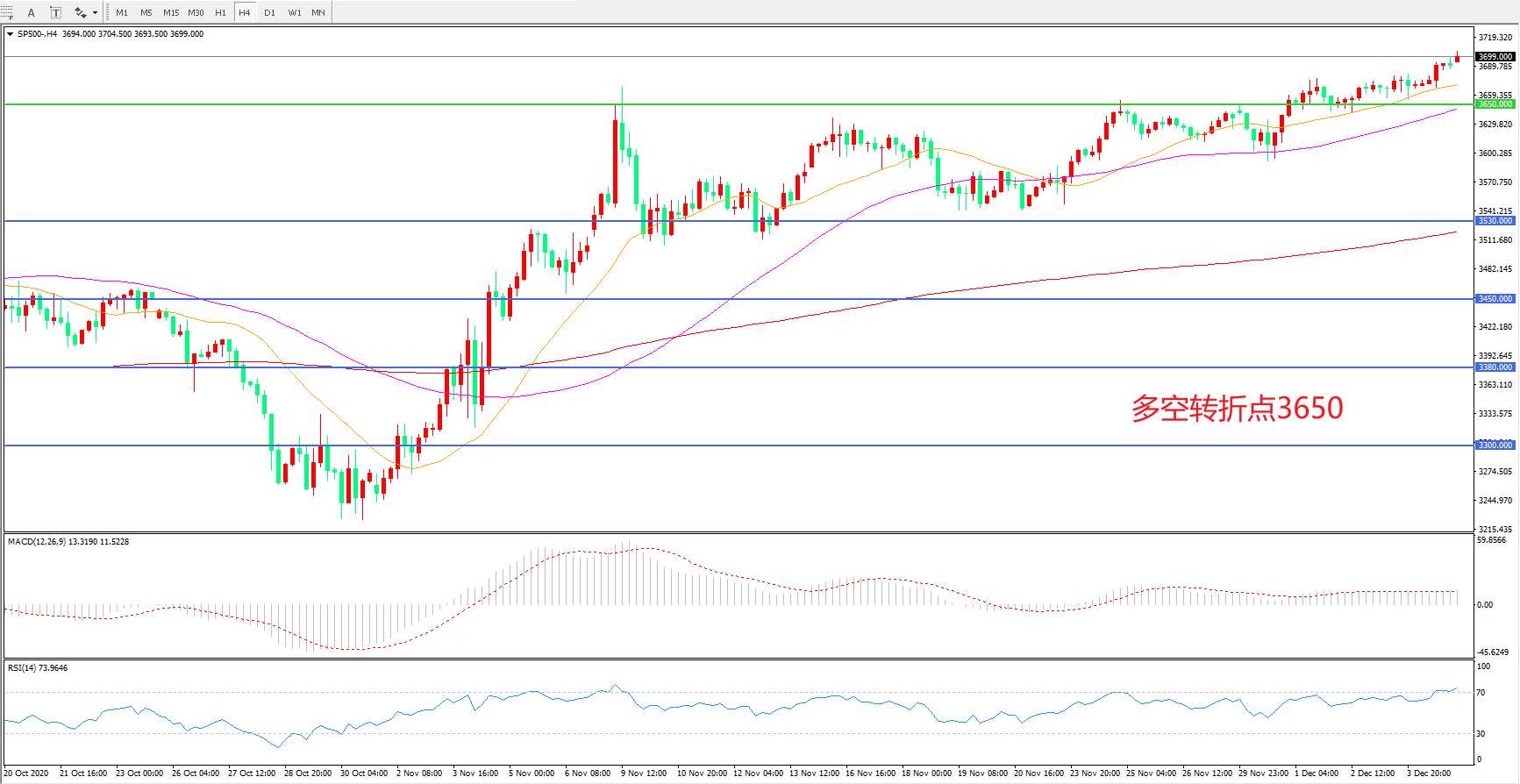 4小时图看,标普500延续高位震荡,上行趋势稳健,3650成为短期多空分水岭,21周期均线成为短期支撑, MACD红柱增加,RSI指标向上,日内延续上行概率较大。