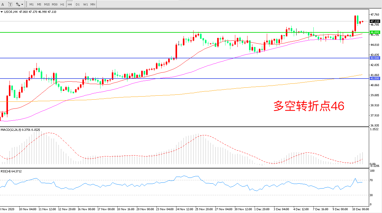 4小时图看,油价长阳拉升,强势突破前期整理区间,46美元成为中期多空分水岭,均线系统有拐头迹象,MACD红柱增加,RSI指标走平,日内延续上行概率较大。