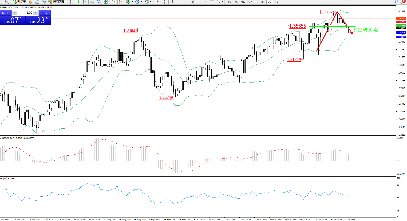 交易策略:1.35355下方看跌,目标1.34506、1.33968