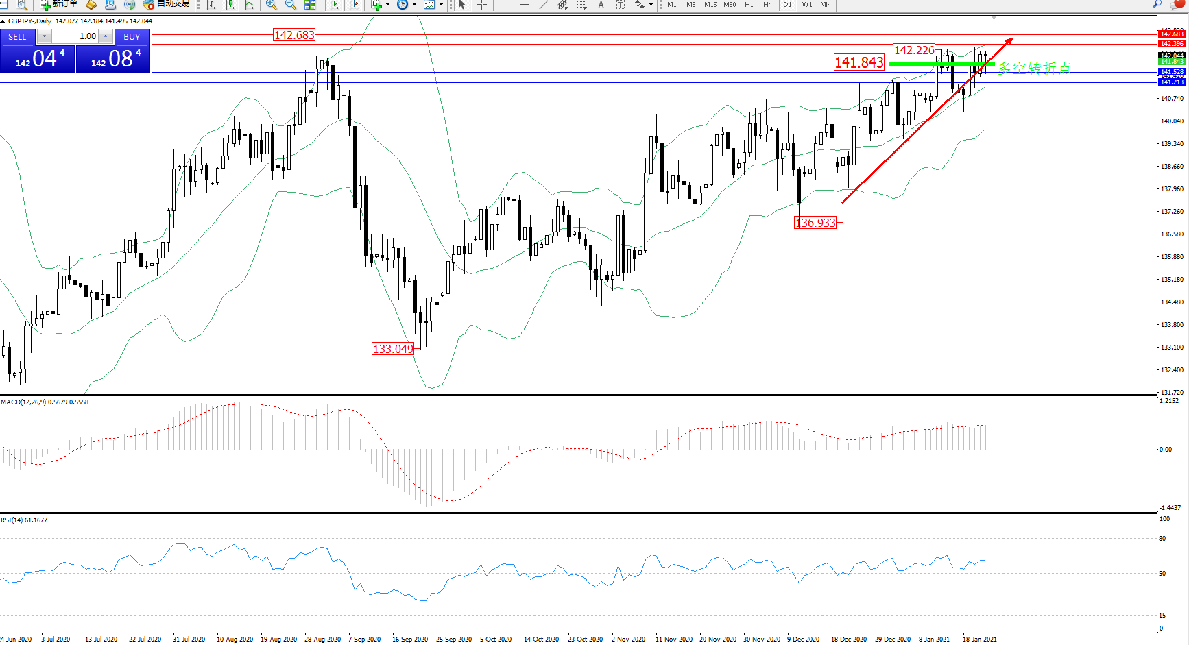 交易策略:141.843上方看涨,目标142.396、142.683