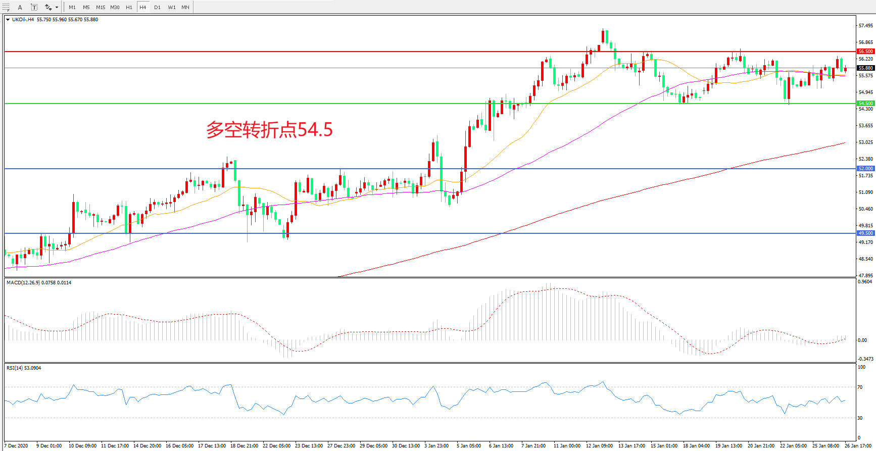 交易策略: 在54.50之上看涨,目标56.50 60.00