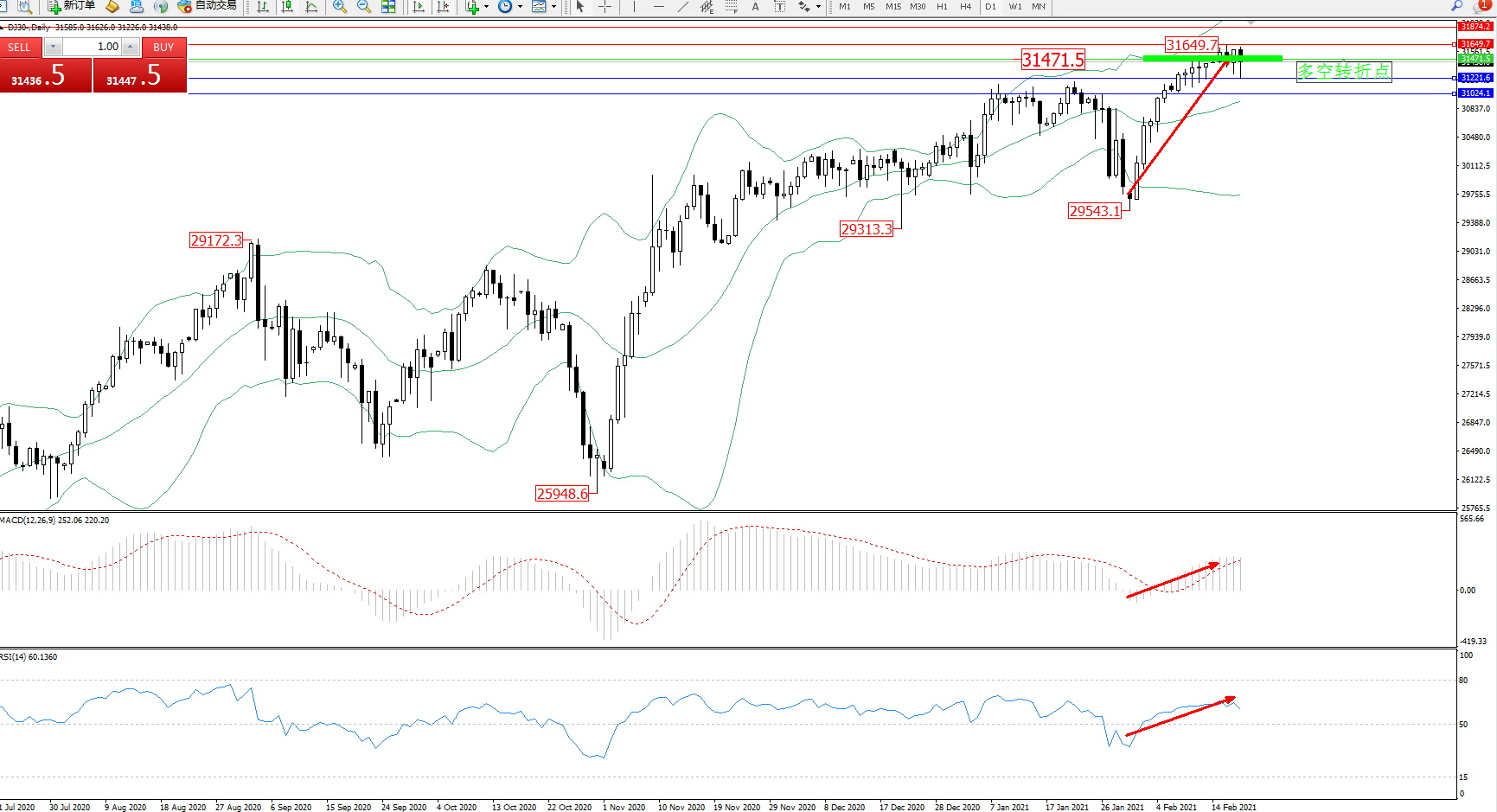 技术点评:高位呈V型反转态势强势拉升上扬,高位抵达31649附近节点徘徊中,处于布林带指标中上轨区间持续震荡,布林带指标呈缓慢张口走势持续中,多头动力维持整理平移态势,MACD指标处于多头区域持续整理上移中,RSI指标处于多头区域维持持续徘徊整理中;