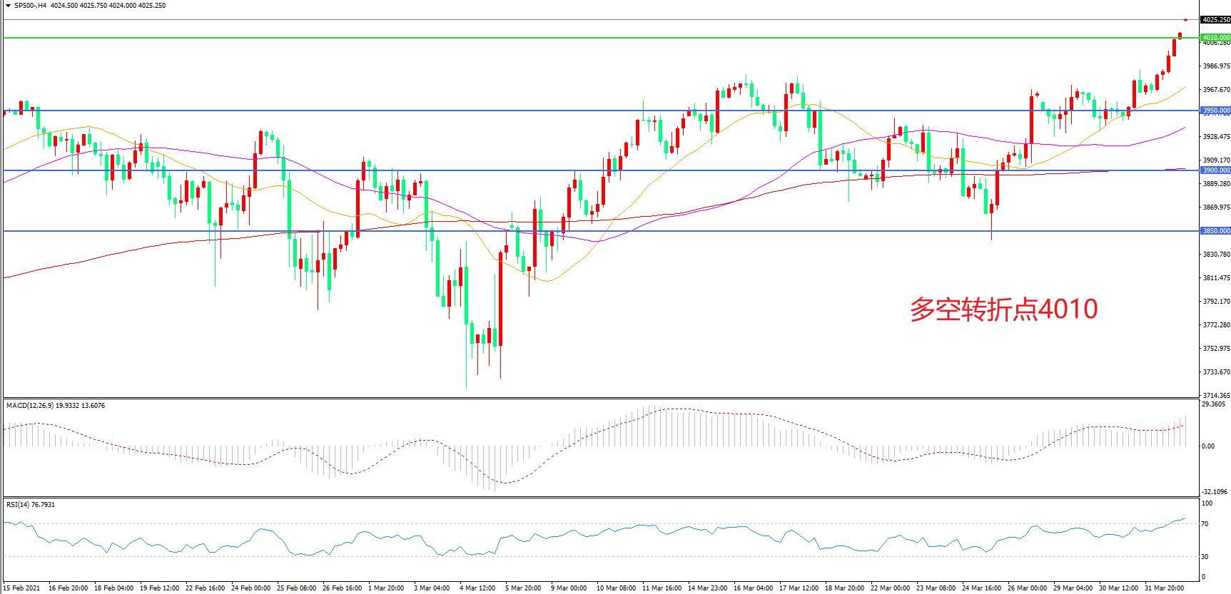 4小时图看,标普500长阳拉升,突破前期整理区间,短期表现偏强,21周期均线成为短期支撑,MACD红柱增加,RSI指标走平,节后震荡上行概率较大。