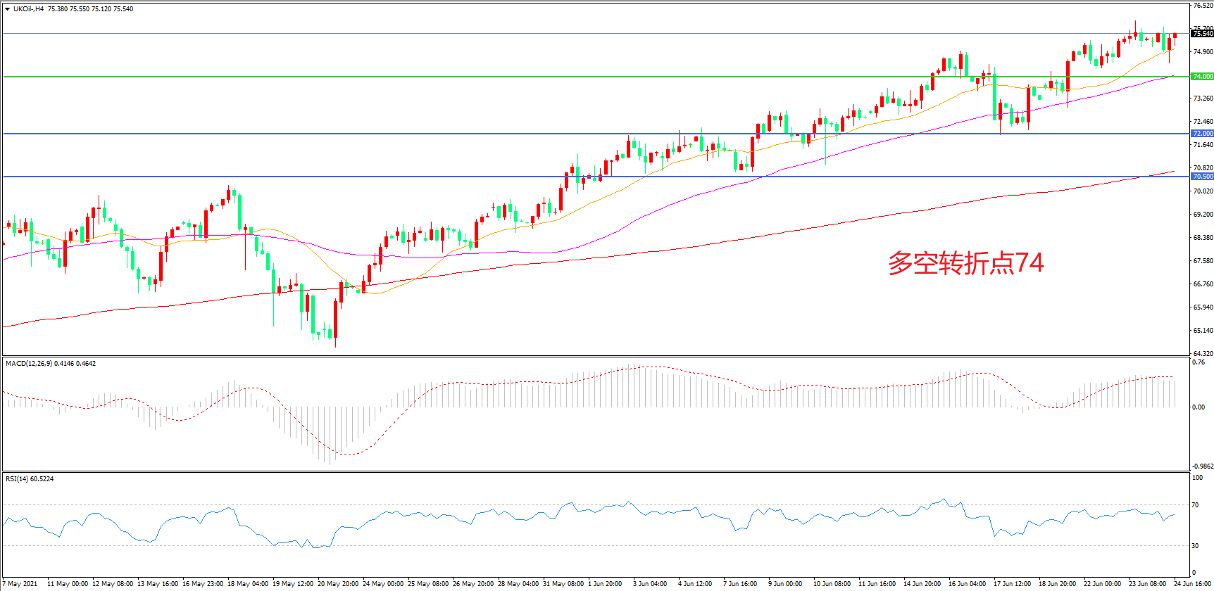 交易策略:在74.00之上看涨,目标77.00 80.00