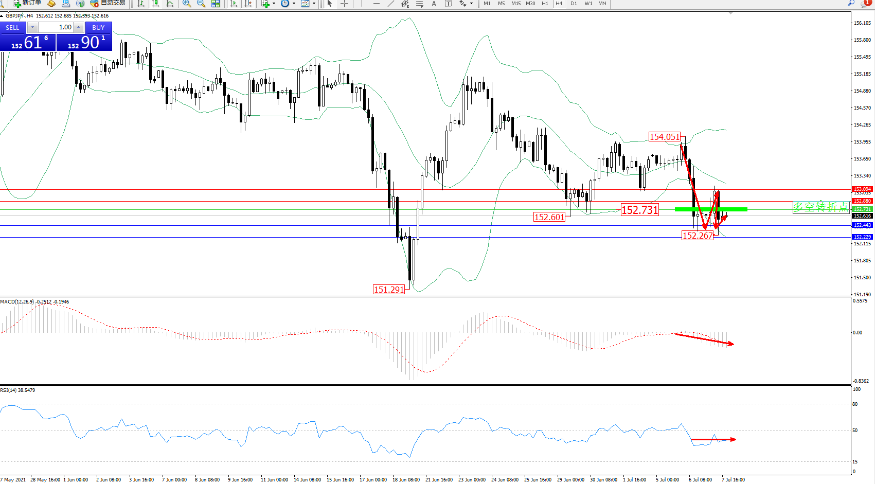 备选策略:152.731上方看涨,目标152.880、153.094