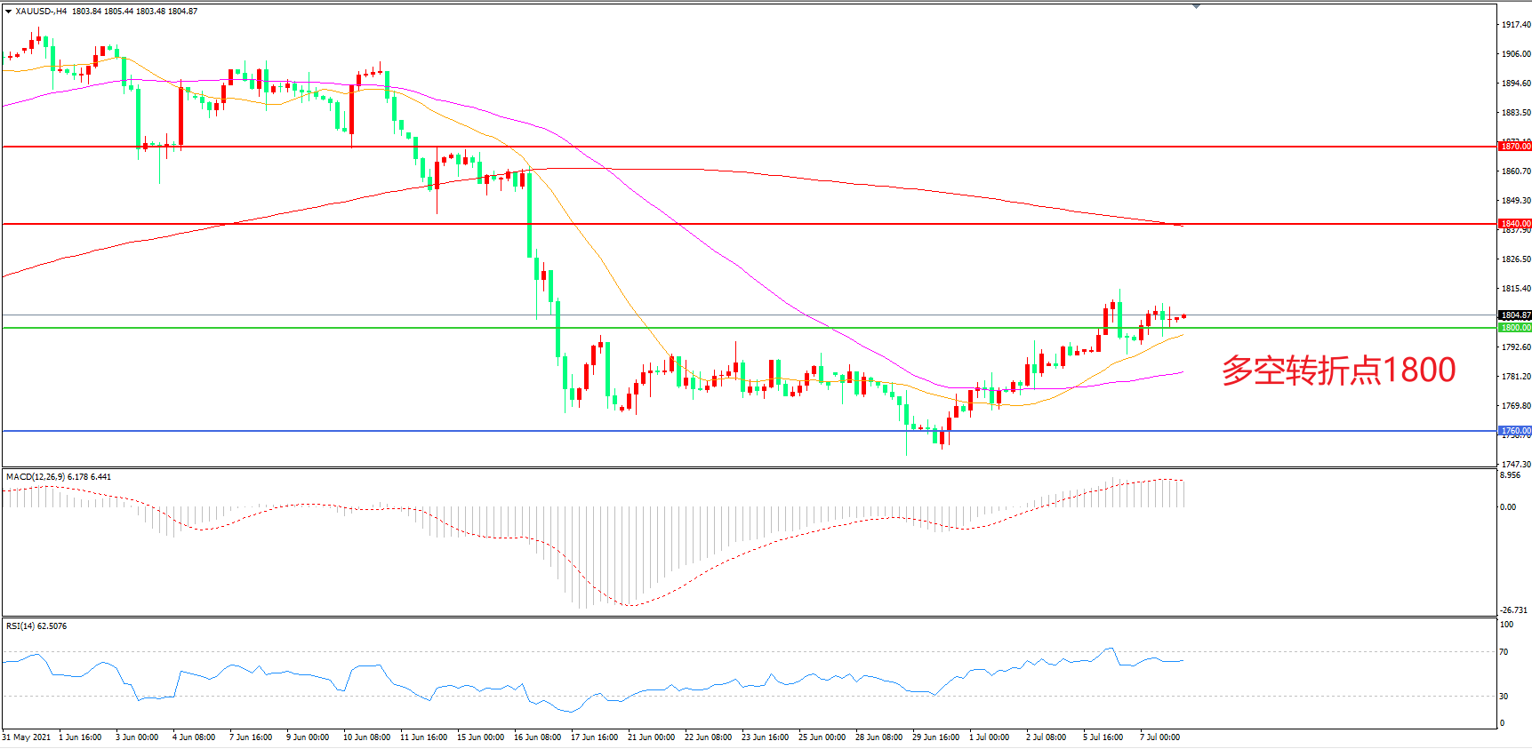交易策略:  在1800.00之上看涨,目标1840.00       1870.00