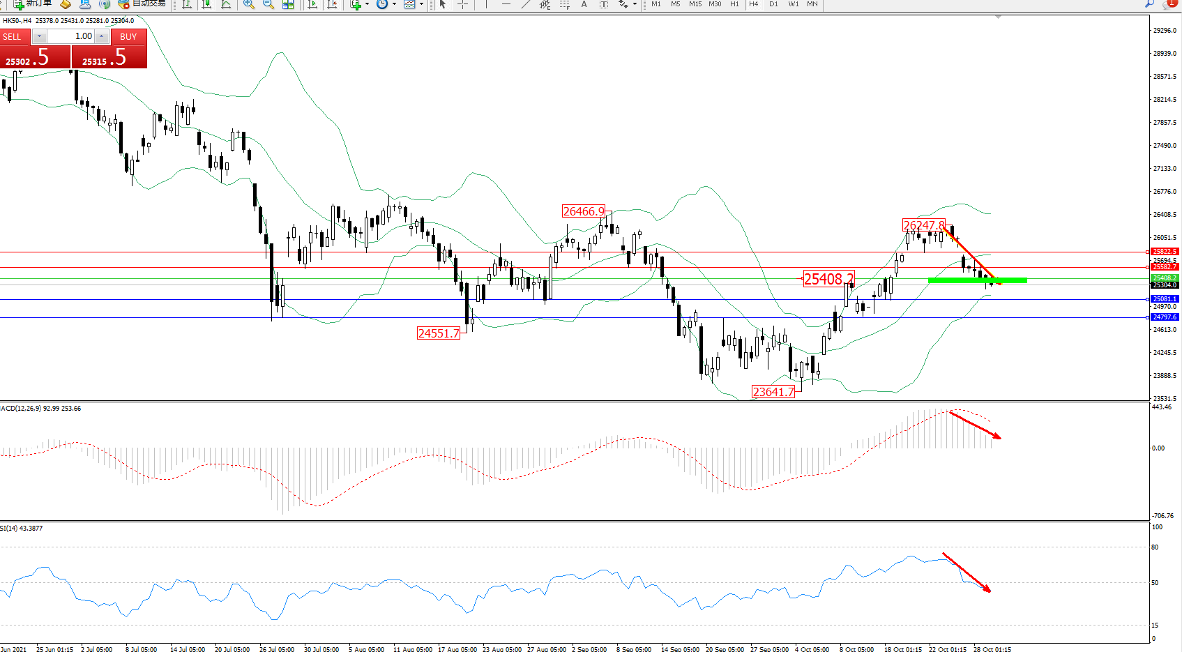 恒指HK50 ——4小时K线图显示: