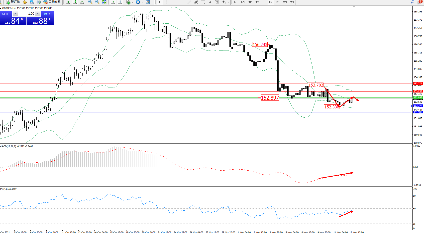 技术点评:长时间维持在布林带指标通道中下轨区间弱势窄幅整理向下移动,短期低位152.330附近得到支撑整理,但整体弱势依旧,市场尚未给出最终方向指引,布林带指标呈弱势整理,MACD指标处于空头区域低位弱势平缓上移,RSI指标处于空头区域维持整理向上移动;