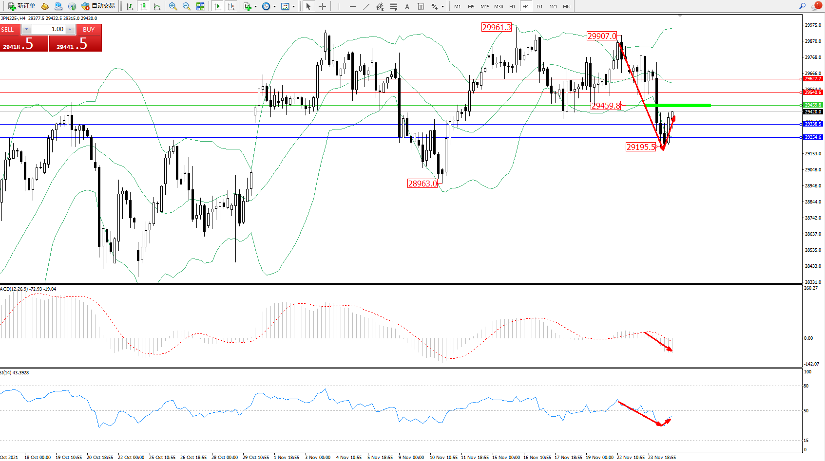 日经指数JPN225——4小时K线图显示: