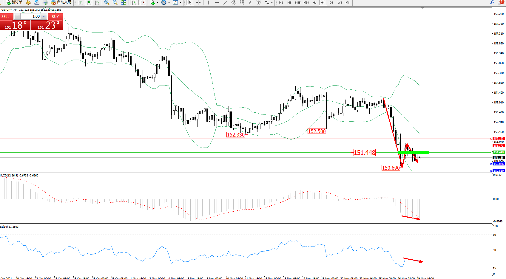 交易策略:151.448下方看跌,目标150.876、150.530