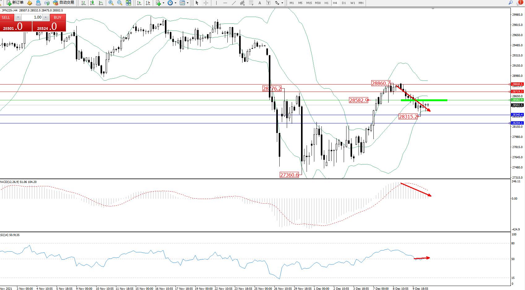 日经指数JPN225——4小时K线图显示: