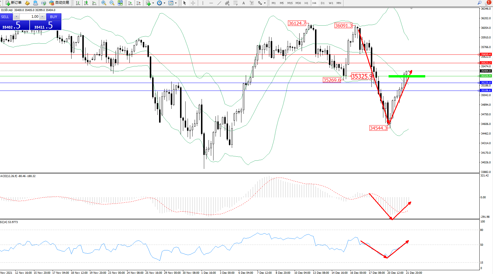道琼斯指数DJ30——4小时K线图显示: