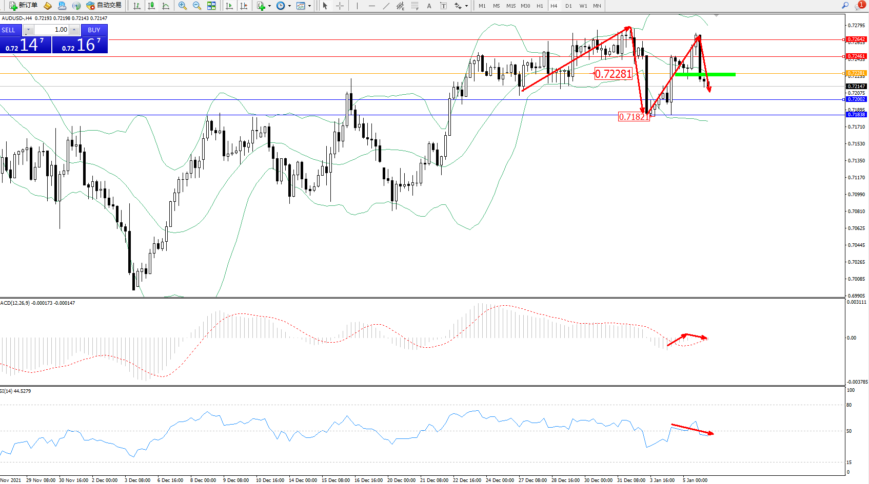 交易策略:0.72281下方看跌,目标0.72002、0.71838