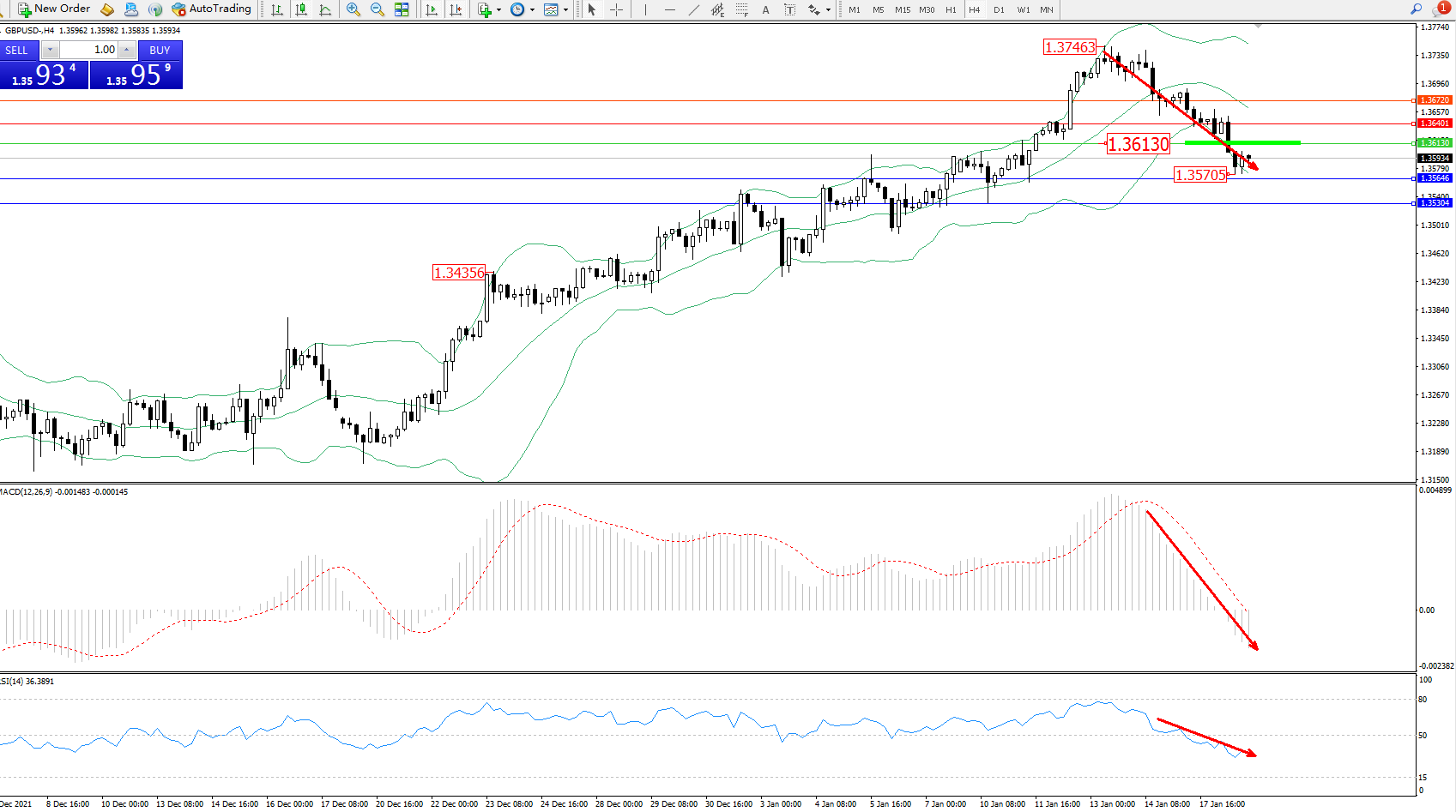 交易策略:1.36130下方看跌,目标1.35646、1.35304