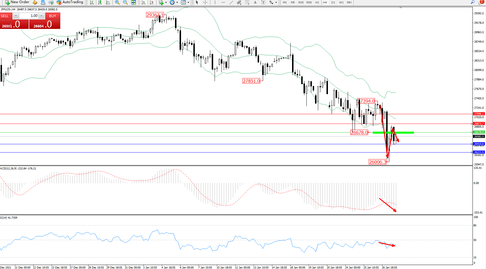 日经225指数1月27日(周四)收盘下跌861.33点,跌幅3.19%,报26150.00点。美联储即将加息,但可能会采取有节制的步伐,从而避免股市和房价大幅下跌。利率上升还是对美元构成支撑,对债券市场不利。利率上行以及过去两年美联储资产购买计划带来的利好消除,使股市受到冲击,日本股市急速重挫。市场波动将在未来几个月进一步加剧。