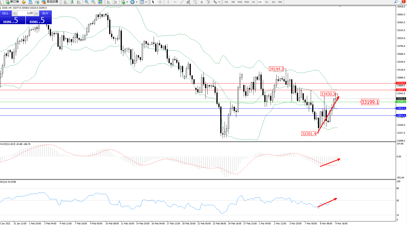 道琼斯指数DJ30——4小时K线图显示: