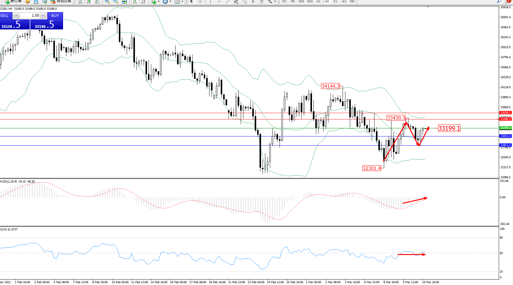 道琼斯指数DJ30——4小时K线图显示: