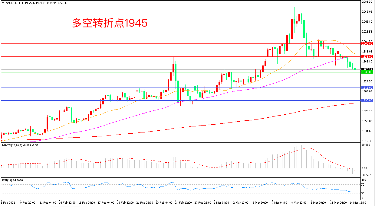 周一(3月14日),投资者期待俄乌谈判进展,静候美联储周三会议结束后公布新政策决议,市场避险情绪有所回落,现货黄金震荡回落,收报1950美元/盎司。美联储将于周四凌晨公布3月利率决议,美联储官员对未来利率和经济形势的最新预测将在3月会议上公布,届时将提供关于他们对未来数月政策紧缩幅度及速度预测的前瞻指引,在重磅会议来临前,金价弱势震荡概率较大。