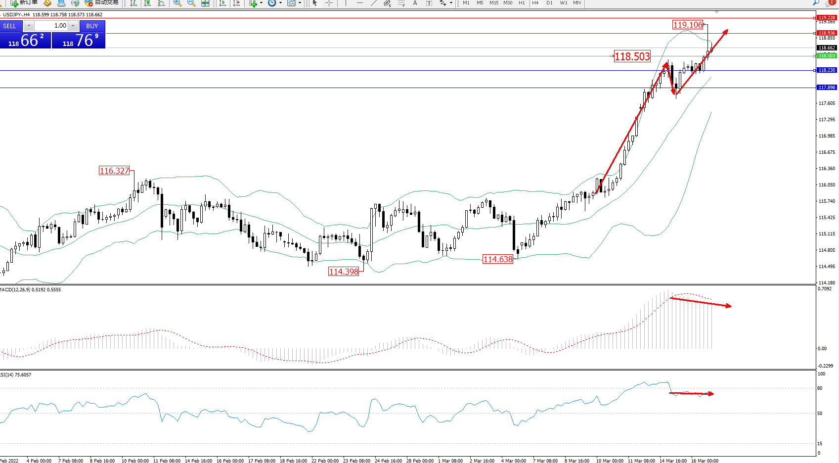 备选策略:118.503下方看跌,目标118.230、117.898