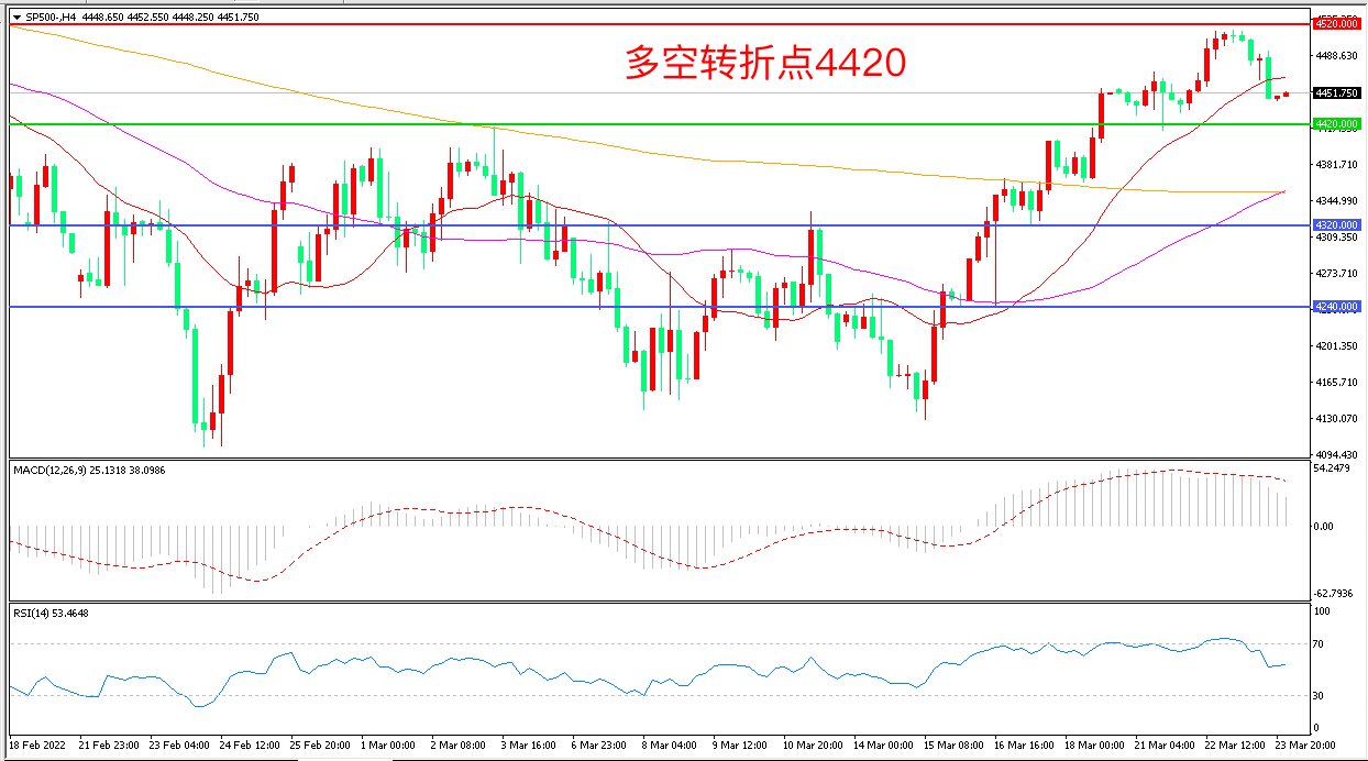 4小时图看,标普500触及4520一线后再度回落,区间震荡迹象明显,均线系统呈多头排列,MACD红柱缩短,RSI指标走平,日内震荡上行概率较大。