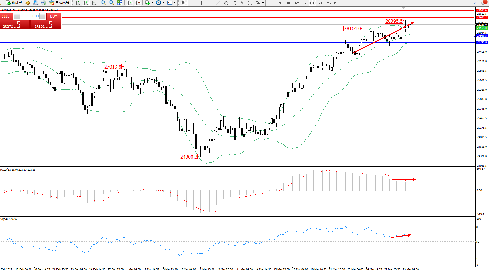 日经指数JPN225——4小时K线图显示: