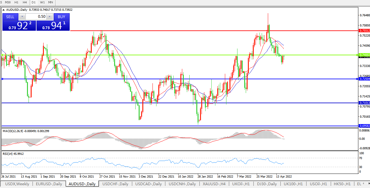 交易策略:0.7400下方看跌,目标0.7250、0.7100